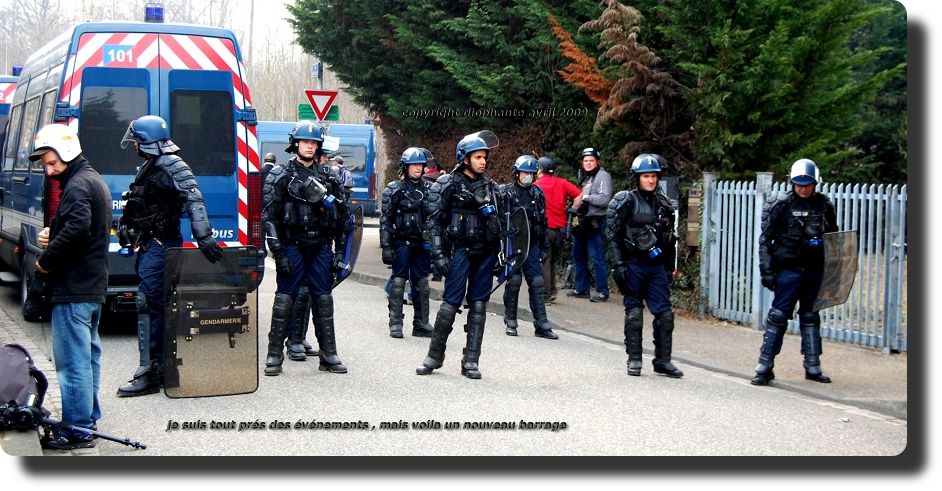 Je m'eloigne de cette rue , en m'engageant sans espoir dans une rue , un monsieur tente de me convaincre de ne pas aller plus loin au bout c'est un grillage , il me semble voir que peut-être il y a un accés , allons- je veut aller au bout de ma démarche. Ma détermination paie , puisque je me retrouve juste devant un groupe qui manifestement est au coeur de l'action